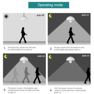 • [أوضاع المستشعر] يتم إيقاف التشغيل تلقائيًا عند أول تركيب لمصباح مستشعر الرادار يحمل الإضاءة الخاصة بك لمدة 40 – 60 ثانية، ثم مصباح LED الذكي في الوضع العادي: يأتي فقط عندما يتم اكتشاف الحركة المظلمة.