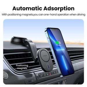 • يوجرين حامل جوال للسيارة لاسلكي مغناطيسي 2 في 1 شاحن جوال للسيارة لاسلكي مغناطيسي للوحة العدادات/الزجاج الامامي/فتحة التهوية، حامل جوال متعدد الاستخدامات لسلسلة ايفون 14/13/12
